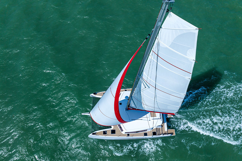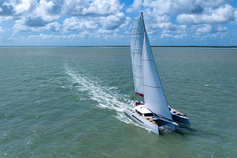 Son passage à la mer, ses performances (à la voile et au moteur) et son confort sont remarquables. Il est facilement manœuvrable en équipage réduit. Ses carènes permettent d’allier une coque centrale « roquée » facilitant les virements de bord et l’évolutivité en manœuvres de port, à des flotteurs aux lignes tendues apportant stabilité de route et prévenant le tangage.